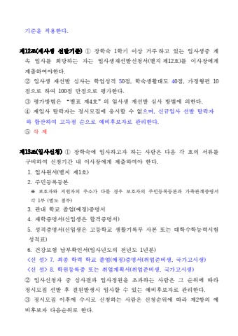 기준을 적용한다.제12조(재사생 선발기준) ① 장학숙 1학기 이상 거주 하고 있는 입사생중 계속 입사를 희망하는 자는 입사생재선발신청서(별지 제12호)를 이사장에게 제출하여야한다. ② 입사생 재선발 심사는 학업성적 50점, 학숙생활태도 40점, 가정형편 10점으로 하여 100점 만점으로 평가한다. ③ 평가방법은 “별표 제4호”의 입사생 재선발 심사 방법에 의한다. ④ 재입사 탈락자는 정시모집에 응시할 수 없으며, 신규입사 선발 탈락자와 합산하여 고득점 순으로 예비후보자로 관리한다. ⑤ 삭 제제13조(입사신청) ① 장학숙에 입사하고자 하는 사람은 다음 각 호의 서류를 구비하여 신청기간 내 이사장에게 제출하여야 한다. 1. 입사원서(별지 제1호) 2. 주민등록등본※ 보호자와 지원자의 주소가 다를 경우 보호자의 주민등록등본과 가족관계증명서 각 1부 (별도 첨부) 3. 관내 학교 졸업(예정)증명서 4. 재학증명서(신입생은 합격증명서) 5. 성적증명서(신입생은 고등학교 생활기록부 사본 또는 대학수학능력시험 성적표) 6. 건강보험 납부확인서(입사년도의 전년도 1년분) <신 설> 7. 최종 학력 학교 졸업(예정)증명서(취업준비생, 국가고시생) <신 설> 8. 학원등록증 또는 취업계획서(취업준비생, 국가고시생) ② 입사신청자 중 심사결과 입사정원을 초과하는 사람은 그 순위에 따라 정시모집 선발 후 결원발생시 입사할 수 있는 예비후보자로 관리한다. ③ 정시모집 이후에 수시로 신청하는 사람은 신청순위에 따라 제2항의 예비후보자 다음순위로 한다.