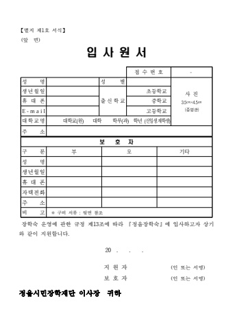 【별지 제1호 서식】(앞 면)입 사 원 서접 수 번 호 -성 명 성 별사 진3.5㎝×4.5㎝(증명판)생년월일출 신 학 교초등학교휴 대 폰 중학교E - m a i l 고등학교대학교명 대학교( ) 대학 학부(과) 학년 (신입생․재학생)주 소보 호 자구 분 부 모 기타성 명생년월일휴 대 폰자택전화주 소비 고 ※ 구비 서류 : 뒷면 참조장학숙 운영에 관한 규정 제13조에 따라 『정읍장학숙』에 입사하고자 상기와 같이 지원합니다. 20 . . . 지 원 자 (인 또는 서명) 보 호 자 (인 또는 서명)정읍시민장학재단 이사장 귀하