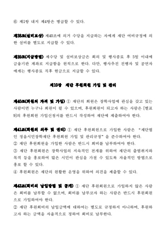 ⑥ 제1항 내지 제4항은 병급할 수 있다.제38조(실비보상) 제40조에 의거 수당을 지급하는 자에게 재단 여비규정에 의한 실비를 별도로 지급할 수 있다.제39조(지급방법) 제수당 및 실비보상금은 회의 및 행사종료 후 5일 이내에 금융기관 계좌로 지급함을 원칙으로 한다. 다만, 행사추진 진행자 및 공연자에게는 행사종료 직후 현금으로 지급할 수 있다.제10장 재단 후원회원 가입 및 관리제40조(회원의 자격 및 가입) ① 재단의 회원은 장학사업에 관심을 갖고 있는 사람이면 누구나 회원이 될 수 있으며, 후원회원이 되고자 하는 사람은 [별표 9]의 후원회원 가입신청서를 반드시 작성하여 재단에 제출하여야 한다.제41조(회원의 의무 및 권리) ① 재단 후원회원으로 가입한 사람은 “재단법인 정읍시민장학재단 후원회원 가입 및 관리규정”을 준수하여야 한다. ② 재단 후원회원을 가입한 사람은 반드시 회비를 납부하여야 한다. ③ 재단 후원회원은 장학사업의 지속적인 전개를 위하여 재단의 출범취지와 목적 등을 홍보하여 많은 시민이 관심을 가질 수 있도록 자율적인 방법으로 홍보 할 수 있다. ④ 후원회원은 재단의 원활한 운영을 위하여 의견을 제출할 수 있다.제42조(회비의 납입방법 및 공개) ① 재단 후원회원으로 가입하지 않은 사람은 회비를 납부할 수 없으며, 회비를 납부코자 하는 사람은 반드시 후원회원으로 가입하여야 한다. ② 재단 후원회비의 납입금액에 대하여는 별도로 규정하지 아니하며, 후원하고자 하는 금액을 자율적으로 정하여 회비로 납부한다.