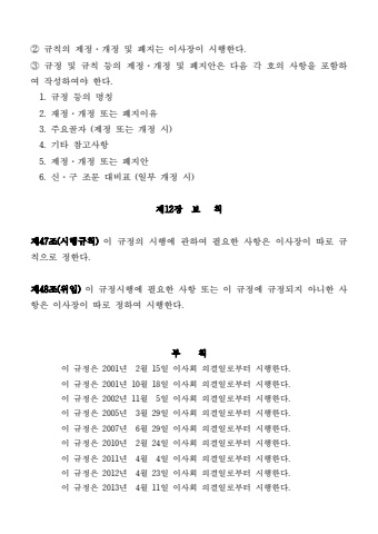 ② 규칙의 제정·개정 및 폐지는 이사장이 시행한다. ③ 규정 및 규칙 등의 제정·개정 및 폐지안은 다음 각 호의 사항을 포함하여 작성하여야 한다. 1. 규정 등의 명칭 2. 재정·개정 또는 폐지이유 3. 주요골자 (제정 또는 개정 시) 4. 기타 참고사항 5. 제정·개정 또는 폐지안 6. 신·구 조문 대비표 (일부 개정 시)제12장 보 칙제47조(시행규칙) 이 규정의 시행에 관하여 필요한 사항은 이사장이 따로 규칙으로 정한다.제48조(위임) 이 규정시행에 필요한 사항 또는 이 규정에 규정되지 아니한 사항은 이사장이 따로 정하여 시행한다.부 칙이 규정은 2001년 2월 15일 이사회 의결일로부터 시행한다.이 규정은 2001년 10월 18일 이사회 의결일로부터 시행한다.이 규정은 2002년 11월 5일 이사회 의결일로부터 시행한다.이 규정은 2005년 3월 29일 이사회 의결일로부터 시행한다.이 규정은 2007년 6월 29일 이사회 의결일로부터 시행한다.이 규정은 2010년 2월 24일 이사회 의결일로부터 시행한다.이 규정은 2011년 4월 4일 이사회 의결일로부터 시행한다.이 규정은 2012년 4월 23일 이사회 의결일로부터 시행한다.이 규정은 2013년 4월 11일 이사회 의결일로부터 시행한다.