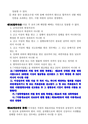임용할 수 있다. ⑤ 최종 점수 동점(소수점 이하 둘째 자리까지 함)으로 합격자가 선발 예정 인원을 초과하는 경우, 시험 위원의 심의로 결정한다.제7조(결격사유) 다음 각 호의 1에 해당할 때에는 직원으로 임용할 수 없다. 1. 금치산자와 한정치산자 2. 파산자로서 복권되지 아니한 자 3. 금고 이상의 형을 받고 그 집행이 종료되거나 집행을 받지 아니하기로 확정된 후 5년이 경과되지 아니한 자 4. 금고 이상의 형을 받고 그 집행유예기간이 종료된 날부터 3년이 경과되지 아니한 자 5. 금고 이상의 형을 선고유예를 받은 경우에는 그 선고 유예기간 중에 있는 자 6. 징계에 의하여 해임처분을 받은 날로부터 3년, 파면처분을 받은 날로부터 5년이 경과되지 아니한 자 7. 법원의 판결 또는 다른 법률에 의하여 자격이 상실 또는 정지된 자 8. 병역의무자로서 병역 기피의 사실이 있는 자 9.「지방공기업법」을 위반하여 벌금형을 받고 2년이 경과되지 아니한 자 10.「성폭력범죄의 처벌 등에 관한 특례법」 제2조에 규정된 죄를 범한 사람으로서 100만원 이상의 벌금형을 선고받고 그 형이 확정된 후 3년이 지나지 아니한 사람 11. 미성년자에 대한 다음 각 목의 어느 하나에 해당하는 범죄를 저질러 파면‧해임되거나 형 또는 치료감호를 선고받아 그 형 또는 치료감호가 확정된 사람(집행유예를 선고받은 후 그 집행유예 기간이 경과한 사람을 포함한다) 가.「성폭력범죄의 처벌 등에 관한 특례법」제2조에 따른 성폭력범죄 나.「아동‧청소년의 성보호에 관한 법률」제2조제2호에 따른 아동‧청소년 대상 성범죄제8조(채용과정 공개) 이사장은 직원의 채용과정을 투명성과 공정성이 유지될 수 있도록 공개하여야 한다. 다만, 공개함으로써 개인의 신상이나 사생활을 침해할 우려가 있는 경우에는 공개하지 아니할 수 있다.